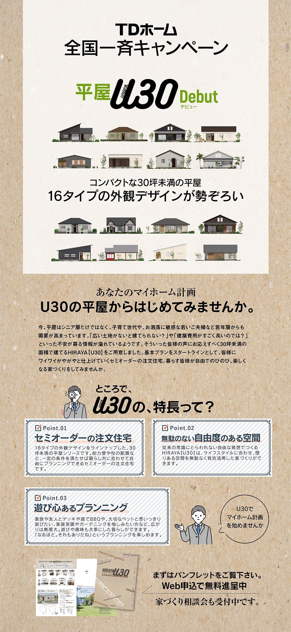 従来の常識にとらわれない自由な発想で、ライフスタイルに合わせ、限りある空間を無駄なく有効活用した、30坪未満の面積で建てるHIRAYA【U30】が誕生。自分らしい家づくりをお考えの方、平屋にご興味のある方にパンフレットを無料で差し上げます。家づくり相談会も同時に受付中です。まずはお気軽にお問い合わせ下さい。