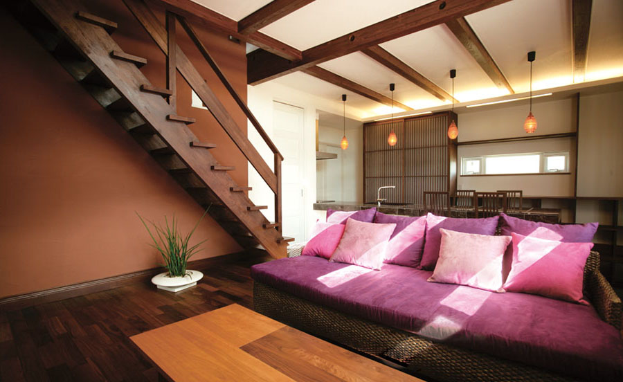表しの梁や自然素材で創られた空間が